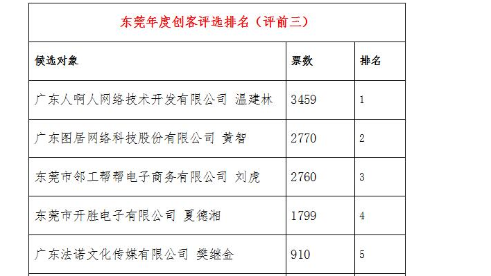 摘要:东莞经济网举办了一场“2015东莞年度创客评选活动”,客观、科学地评选出东莞市2015年最具代表性的年度十大经济事件、经济人物与成长性企业。合作媒体有:东莞时间网、腾讯.大粤网、东莞阳光网、东莞时报、新浪网、房掌柜、驼牛网等。在第一轮评选中,广东人啊人网络技术开发有限公司董事长温建林人气高涨,持续霸占榜首位置,黄智和樊继金则从最初的第五和第六名,分别上升至第二和第三名,跻身前三。