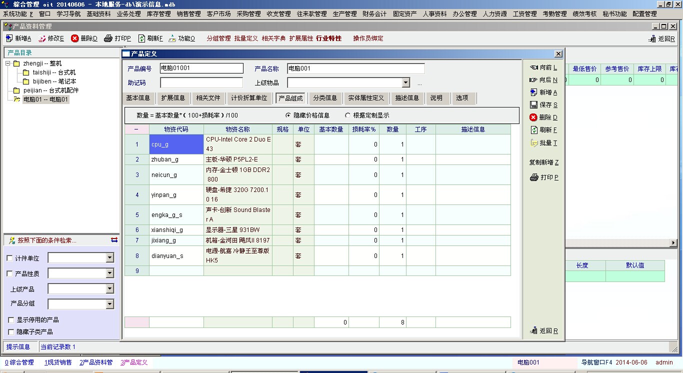 企业内某个零件是另外几个零件组成的,如何选中某个零件,其他几个零件的价格和数量就形成了。
