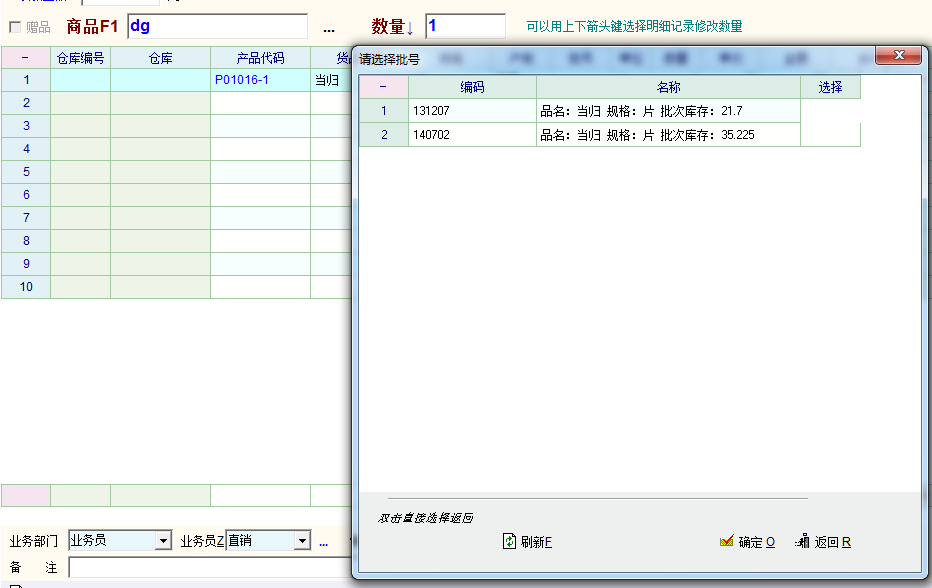 缘起:系统本身也提供开单时的批号选择功能,但是对批发公司分秒必争的忙碌的开单员来说又要用鼠标点选又要用键盘操作 是比较痛苦的事,所以这些同事强烈要求实现一个简单直观的 【 全 键 盘】操作的批号选择功能,经过几次折腾,有了以下脚本: (请忽略示例图上的 编码 、名称的列标题,那是软件自动产生的,修改不了。其实第一列是批号。) int init_row() { //----------------------------调用批号及生产日期---------------------------- string numsql; numsql="select edt_res.batch_no, '品名:' & res.res_name & ' 规格:' & res.res_spec & ' 批次库存:' & edt_res.num from edt_res,res where edt_res.res_id='"; numsql=numsql + res_id + "' and edt_res.res_id=res.res_id" ; db_select_area(0); db_run(numsql); db_show_and_select('请选择批号'); batch_no=db_res(0); db_select_area(1); db_run("select produce_date from edt_res where res_id='" + res_id + "' and batch_no='" + batch_no + "'");//调用批次对应的生产日期 produce_date=fmt_date(db_res(0),'yyyy.mm.dd'); //格式化生产日期 }; 多谢厦门-橘子*指点长sql语句的换行; 多谢小麦老师指点sql查询语句的字段和字符串的串联。 如有更好的实现方法还请高手指点! 》》》》》》》 2022.02.24 更新 《《《《《《《《《 int init_row() { string sql; sql="select b.res_name as 品名,b.res_spec as 规格,a.batch_no as 批号,a.num as 批次库存 from edt_res a left join res b"; sql += " on a.res_id = b.res_id where a.res_id = '" + res_id + "'"; db_select_area(0); db_run(sql); db_show_and_select_ds('请选择批号'); batch_no = db_res(2); db_select_area(1); db_run("select produce_date from edt_res where res_id = '" + res_id + "' and batch_no = '" + batch_no + "'");//调用批次对应的生产日期 produce_date = fmt_date(db_res(0),'yyyy.mm.dd'); //格式化生产日期 return 1; }; 未详细测试,仅供参考。 |
