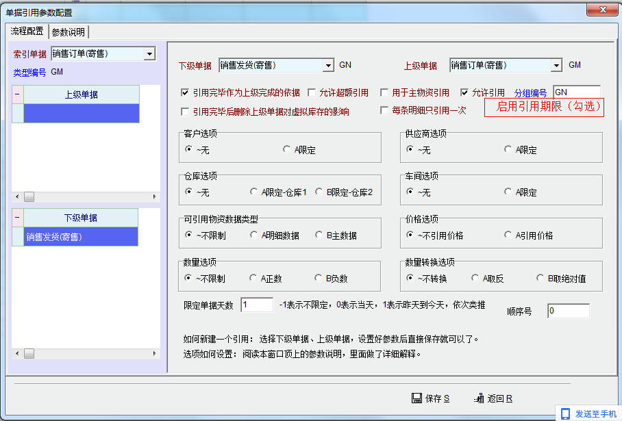 功能大概意思: 在单据引用流程设置里,可以有个(启用引用期限),启用后,在单据对象的表头上方可以对该张表单独立设置,下级的引用期限。选定限期后,如下级单据引用时,超出了该张表单的引用时间,在引用时,不在显示过期单据,变为过期失效引用,无法效用。
