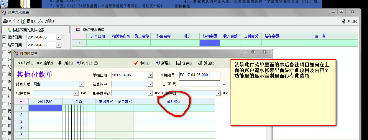 请教各位老师:如何在账户流水账表里面显示 收、付款单里面的事后备注项目的内容