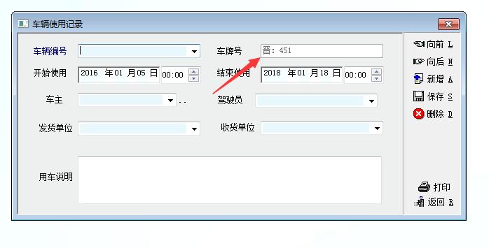 你选择车辆编号,车牌会自动读取你车辆建档时候填写的车牌