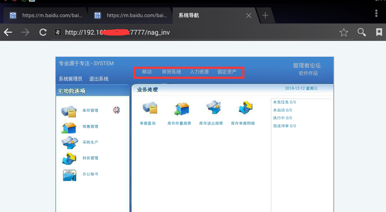 老师 我用的是综合系统,APP登录进入传统入口后,只显示一个库存管理,销售管理,采购生产,财务管理,办公秘书,也没有切换按钮,