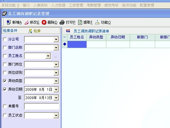 1、当添加“岗位类型”--新聘、“异动日期”--8/1-8/13,再按检索,无内容(事实上,有两位同志在8月3日属新聘)。如图1