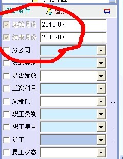 工资管理中部分地方起止月份显示都是灰色的,这样会产生一些误导,一般来说,灰色就是不可用的。但事实上,在工资管理中,这个起止月份不但可用,而且必须使用,否则就不能检索出欲查的数据出来。故建议把灰色取消,改为与其它一样,现略举几个地方,如图: