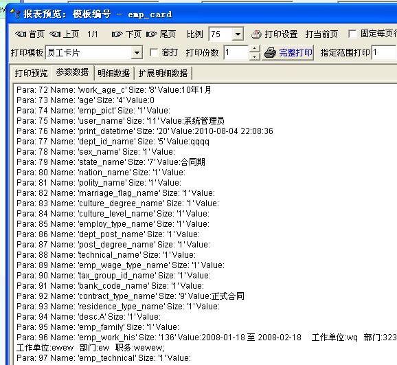 工作经历是在描述信息里,打印预览只能看到基本信息里的东西,参数数据里不涵盖