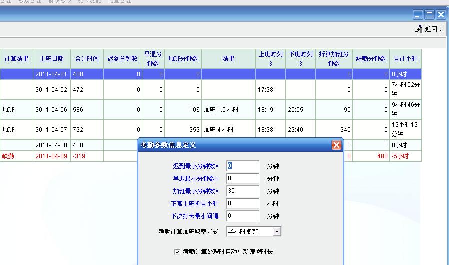 可以用脚本来实现,具体做法如下: 考勤日帐=》功能=》明细列表脚本定义,然后把下面的脚本复制进去保存即可。 int load_ext() { return 1; }; int show_row_ext() { int h,m; string sh; h = total_minute/60; sh = h; m = total_minute - h*60; if(m>=30) sh = sh + ".5"; sh = sh+"小时"; total_hour = sh; return 1; }; int main() { return 1; };