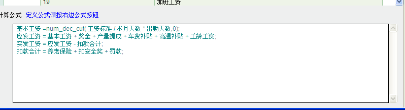 公式改为: 基本工资 =num_dec_cut( 工资标准 / 本月天数 * 出勤天数,0);