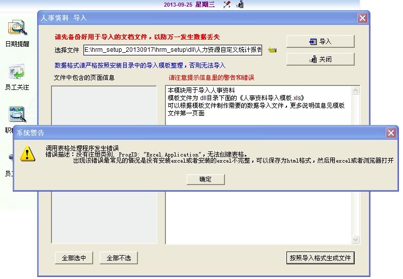 我无法导入数据,老是提示格式错误,文件导入导出还是不行 我按照使用手册上的做过了 昨天可以的今天又不行了 现在员工 的资料还是手动录入