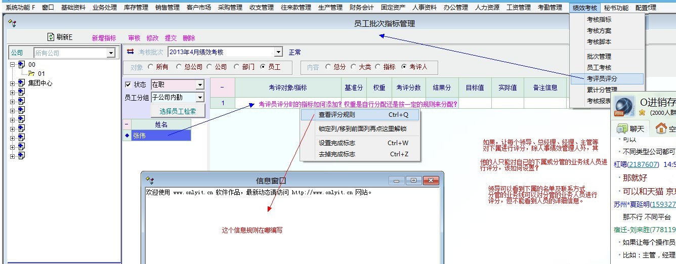 目前,系统考核信息没有审核环节,就像做好了一张报表,或填写了一个数据,如果可以控制这个数据的修改情况,那么,就可以作为一个操作的依据,考评人对一个操作员评分的动作就是修改这个数据的动作,那么,考评人是否可以对下属进行评分,还是上下左右的评分(360度),这里没有这个功能,因为,系统不可能授予每个人都有绩效模块的完全权限,那么,在绩效实施的过程中,对员工考核就成了难题,只能由绩效人员来收集信息并登录系统,