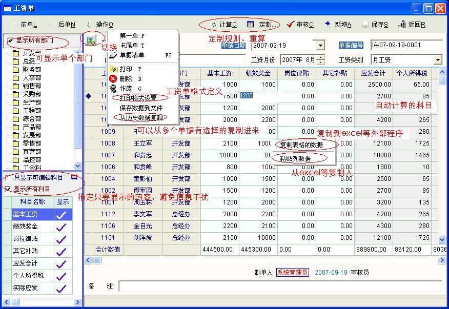 方便的工资录入界面,可指定部门显示、指定科目显示,自动计算