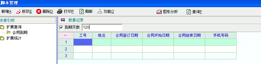 1、打开配置管理,点数据脚本。点左手边,扩展查询,右键增加一个,脚本名称随便填,如提取到期合同。 2、在下面的脚本定义框中输入如下脚本 int func_def_lmt() { def_lmt_str("ddate","到期天数"); return 1; }; int func_def_field() { db_set_field_count(6); db_set_field_info(0,'emp_id',"工号",60); db_set_field_info(1,'name',"姓名",60); db_set_field_info(2,'sign_date',"合同签订日期",100); db_set_field_info(3,'beg_date',"合同开始日期",100); db_set_field_info(4,'end_date',"合同结束日期",100); db_set_field_info(5,'mobile',"手机号码",100); return 1; }; int func_def_imp() { return 1; }; int func_init() { return 1; }; int func_query() { if(lmt_checked("ddate")) { //msg(lmt_val("ddate")) } else { def_lmt_set_val("ddate","90"); } string 到期日 到期日=date_add(get_cur_date_std(),lmt_val("ddate")) string sql; sql="select a.emp_id,b.[name],a.sign_date,a.beg_date,a.end_date,b.mobile from emp_contract a,emp b" sql=sql+" where a.emp_id=b.emp_id and end_date between '"+get_cur_date_std()+"' and '"+到期日+"' and b.state!='F'" db_run(sql); return 1; }; 保存即可 退出后就可以看到扩展查询下面多了个提取到期合同的项,单击,再点查询 |