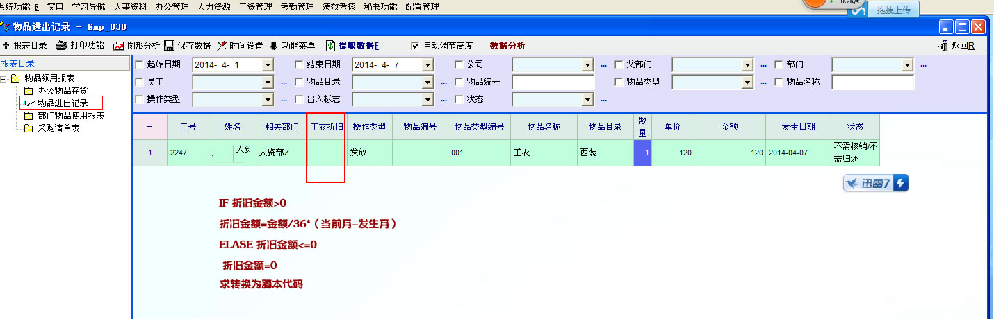 在物品管理里录入 工衣 但我们工衣是服务满3年就不用掏钱  不满3年按折旧算,自己买单!明白了吗