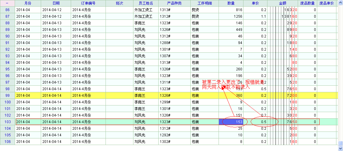 系统设计就是这样,不允许重复的记录,如果要区分,则可以采用不同的班次或者不同的产品。