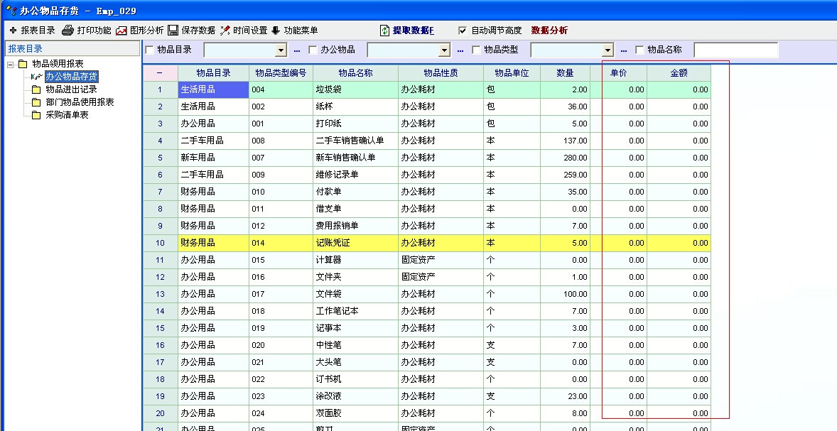 办公物品通过采购入库的时候,单价和金额无法自动提交到物品管理存货报表里的单价和金额里体现!只能去物品定义里面定义,因为每次购买的相同产品有可能价格不一样!每月统计报表无法统计库存金额