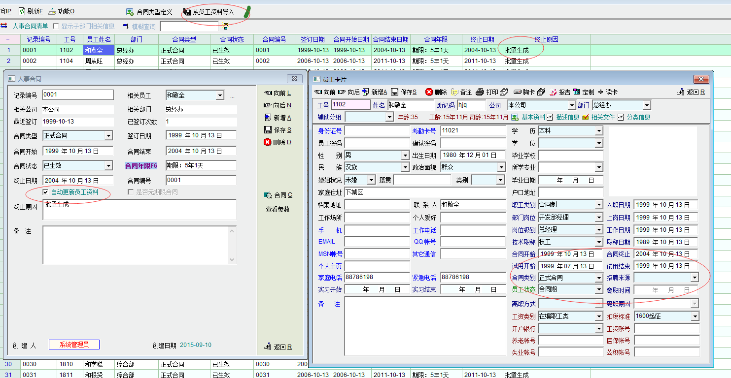 人事合同是与员工资料相关联的,所以只要在人事合同里面录入了合同信息,在员工资料里面也同时能看到这一块的信息。因此我建议职称管理、工作经历、学习经历也应该与员工资料相关联,以减少重复录入信息的次数,降低工作量