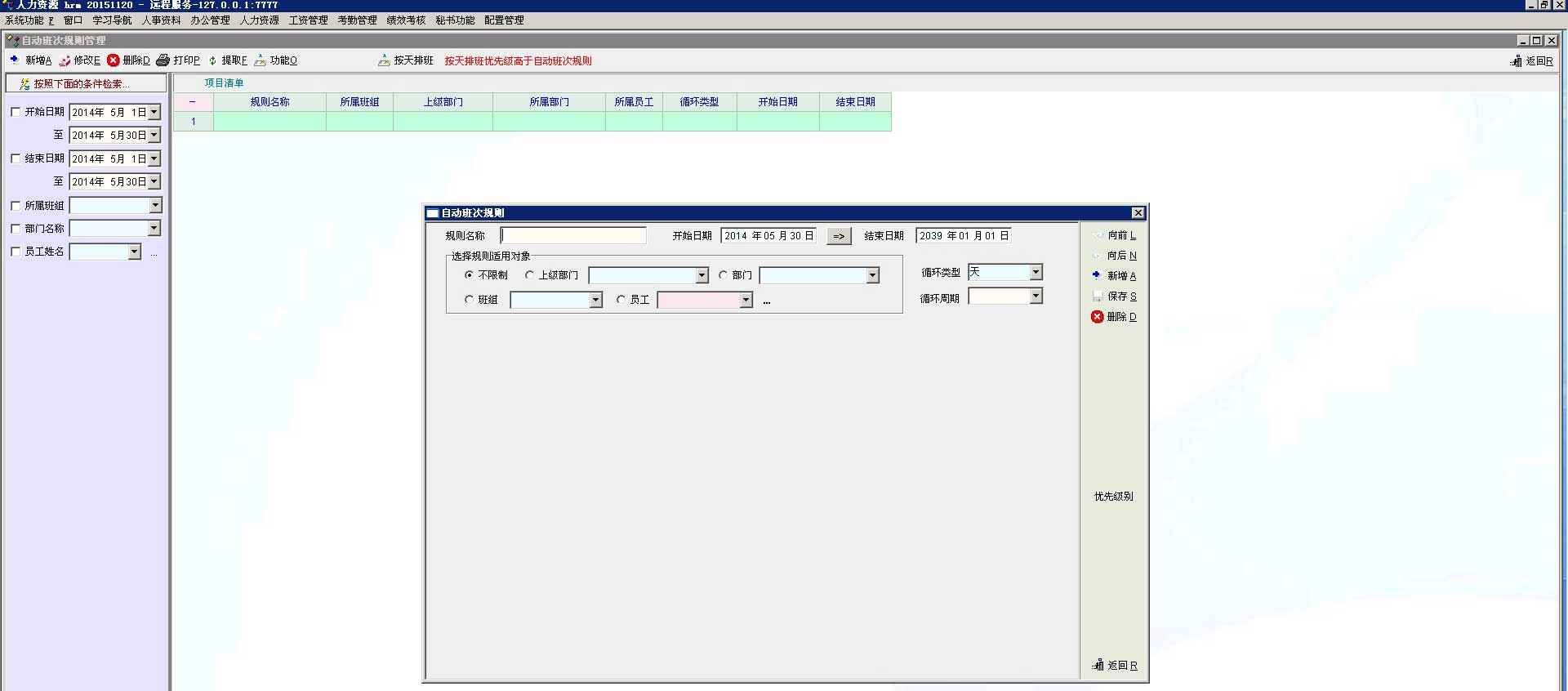 最新版20151121,从access数据库迁移到sql数据库后出现bug,考勤管理--员工排班--自动规则,点击新增的时候对话框中没有星期1、星期2一直到星期7,这些信息了,下面是一片空白,在access数据库中不存在此问题,我测试了一下从20141115版本开始此问题一直存在,没有人反馈,应该不是我的个例,有相同问题的请跟帖。