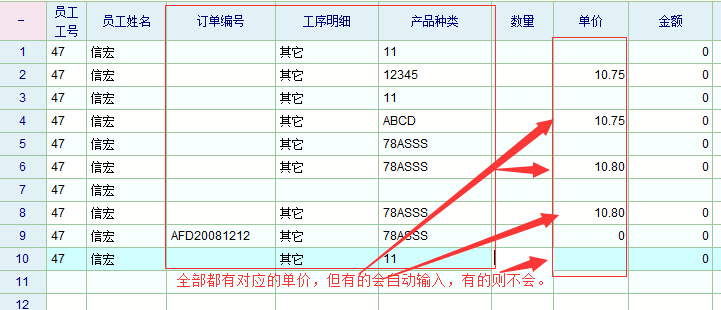 经测试,目前只输入“工序明细”,可以自动绑定输入该“工序明细”对应的单价。但当是“产品种类+工序明细”时,系统没有自动绑定输入该“产品各类+工序明细”对应的单价。“订单编号+产品种类+工序明细”时,系统也没有自动绑定输入该“订单编号+产品各类+工序明细”对应的单价。