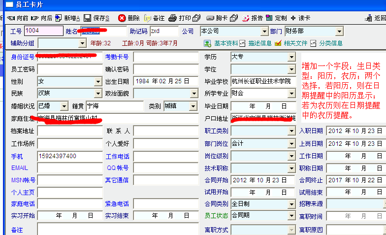 对,你这个建议不错,员工资料里本身有个出生日期,系统默认是根据身份证上来取值的,直接直接选择更改吧,但对于农历的话,即使改了阳历也没什么用的,需要再添加个字段,用来输入农历生日,后面的日期提醒就取这两个字段就好了,希望软件越来越人性化。