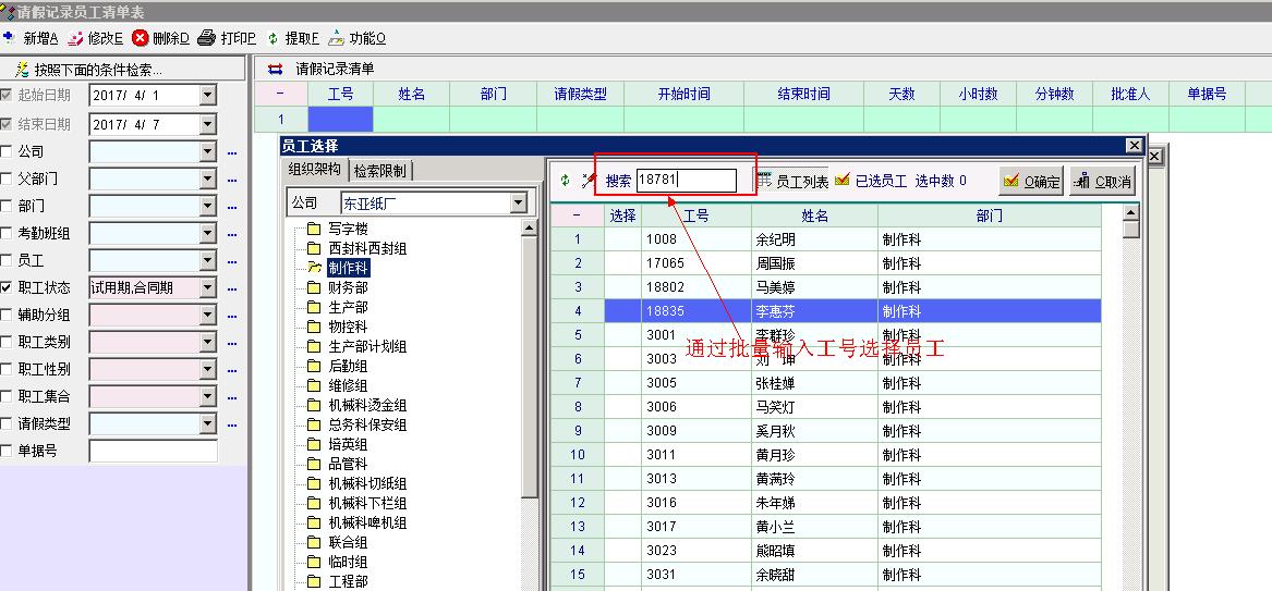 2、建议请假登记里可以批量输入员工工号来登记请假(此功能适合登记不同部门同时间段请假的员工),可大大提高工作考勤文员的效率。