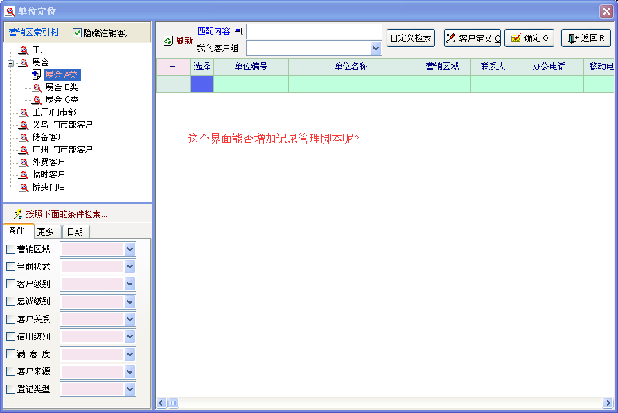ps:客户档案界面的客户显示,我已经通过脚本定义书写了适合我自己公司的显示规则,所以对应的上面2个也希望能添加记录管理列表脚本定义功能以实现本公司规则显示客户档案。