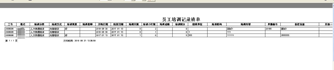 人事资料》》培训记录》》打印时,员工培训记录清单不能定制打印模板(跟据公司的模板,从软件里读取相应的培训时间、课时、编号、部门等信息后打印出来)