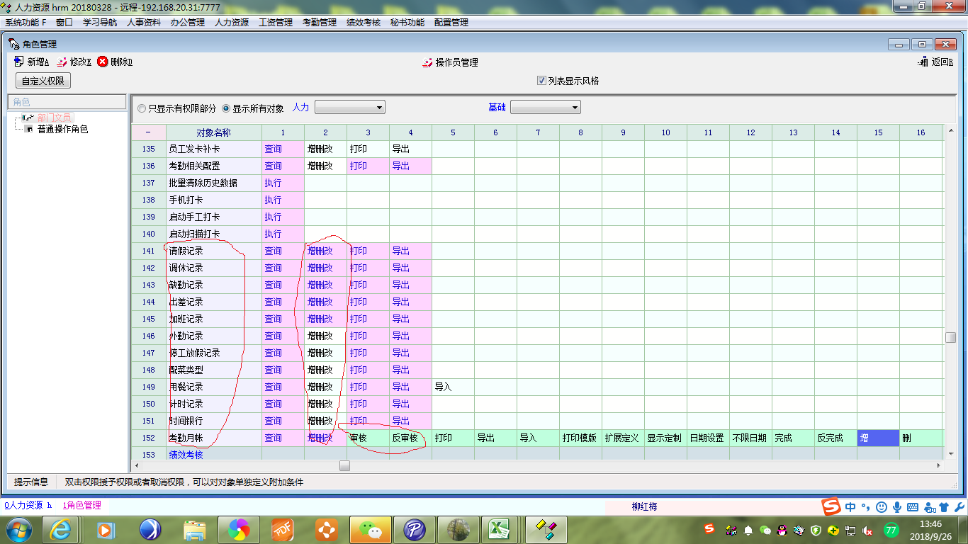 您好,您看是否可以将人事考勤中的权限进行相应更改,将“请假记录”“调休记录”“缺勤记录”“出差记录”等所有选项中的“增删改”,分开变为“增”、“删”、“改”三项,这样可以细化权限,方便各部门文员的使用和人力资源部门的管理,谢谢