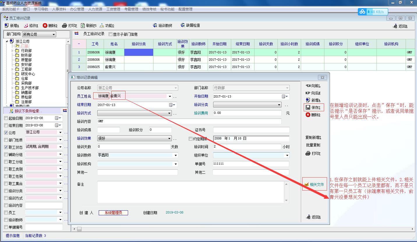 2.在添加相关文件时,要求先保存,而且相关文件只能生成一条记录里面。(如有一个30人的GMP培训,有一个KK的相关文件,30条记录里面只有一条有相关文件)
