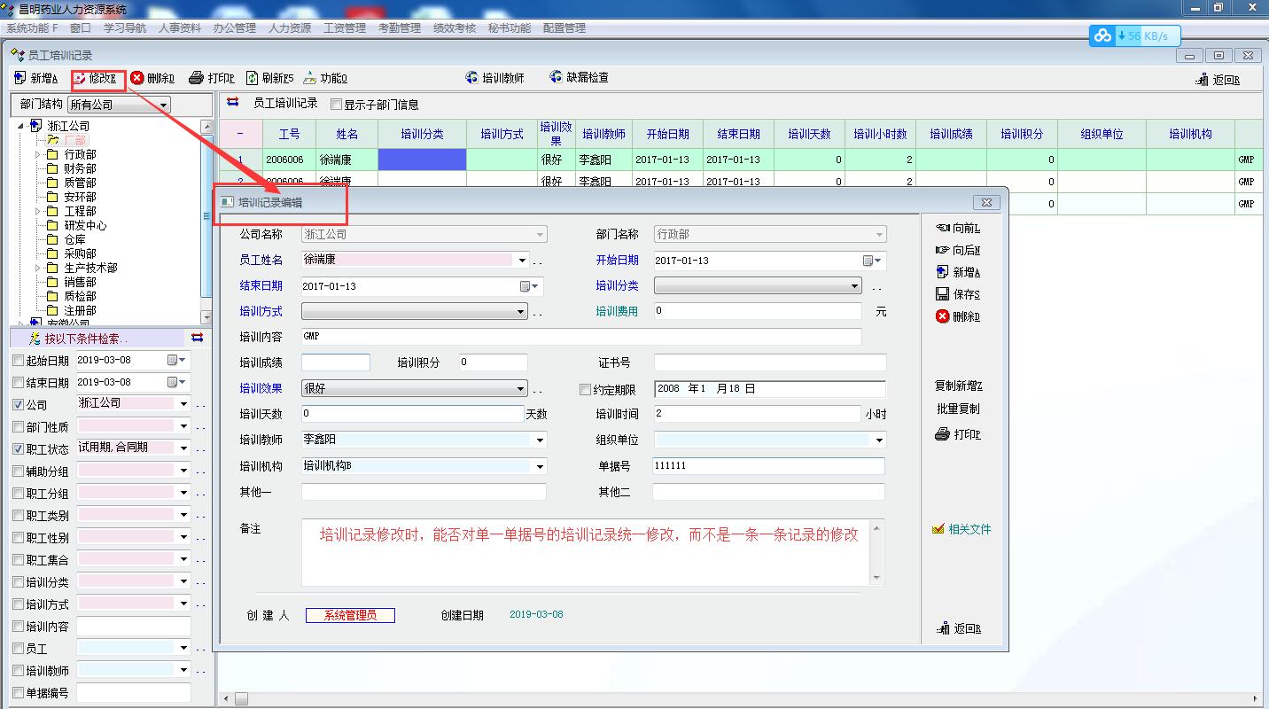 3.在修改相关培训记录里,只能一条一条修改,不能对同一单据号的相关记录统一修改。