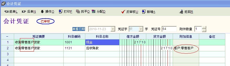 设置凭证摘要为“收到[客户]货款”,此时的中括号中的客户会自动读取图2中所圈红部份的值,以简化凭证摘要的书写。。。