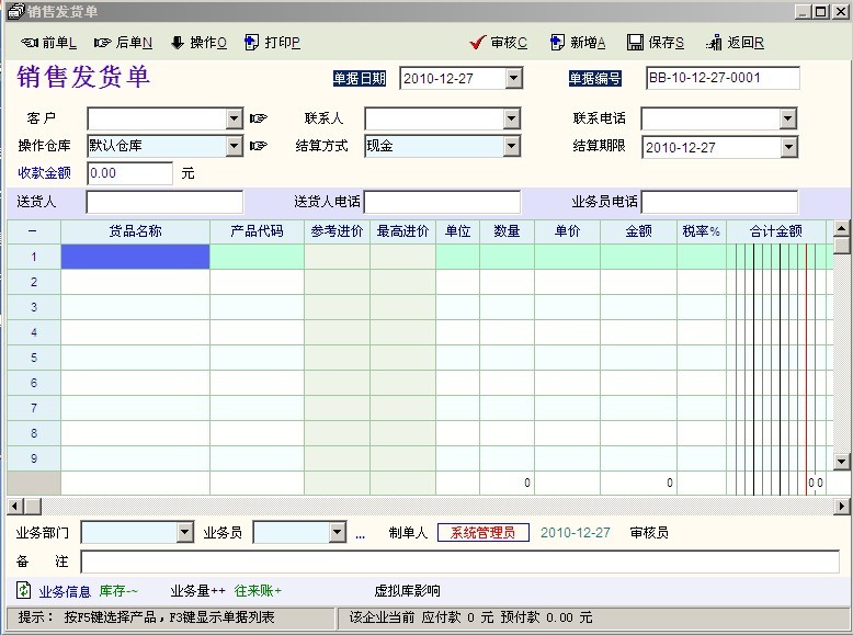 在单据的表头能否增加一些: 1,业务员的姓名与电话号码; 2,送货人的电话号码 |