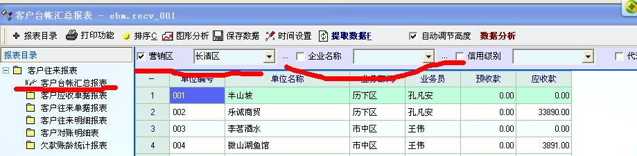 还有选业务部门后,该部门的客户也可以关联上;选某仓库或目录后,该仓库的产品也相应关联上;选业务员后,该业务员的客户自动关联上,这样提高查询的效率,要不在查询项很多的情况下特别麻烦。我试了试,现有表查询中,就客户查询汇总报表中有这个功能,找那个营销区域后,相应的客户就出来了,很方便。