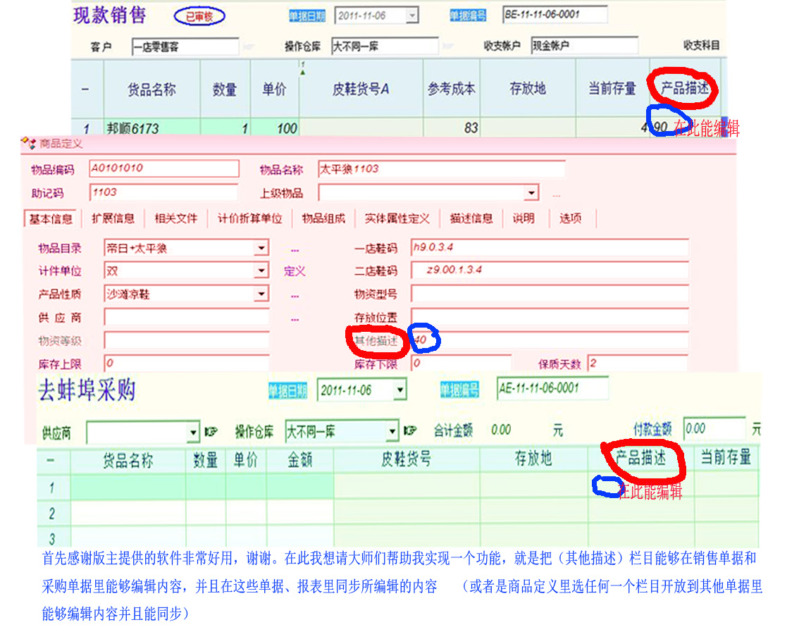 求助_求助:商品定义栏目(其他描述)能在其他各单据里编辑内容并且能同步)_产供销