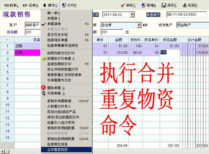 太有才了,合并重复物资是有前提的,你的两笔重复物资,第二笔是有打折扣的,那是不能合并的.