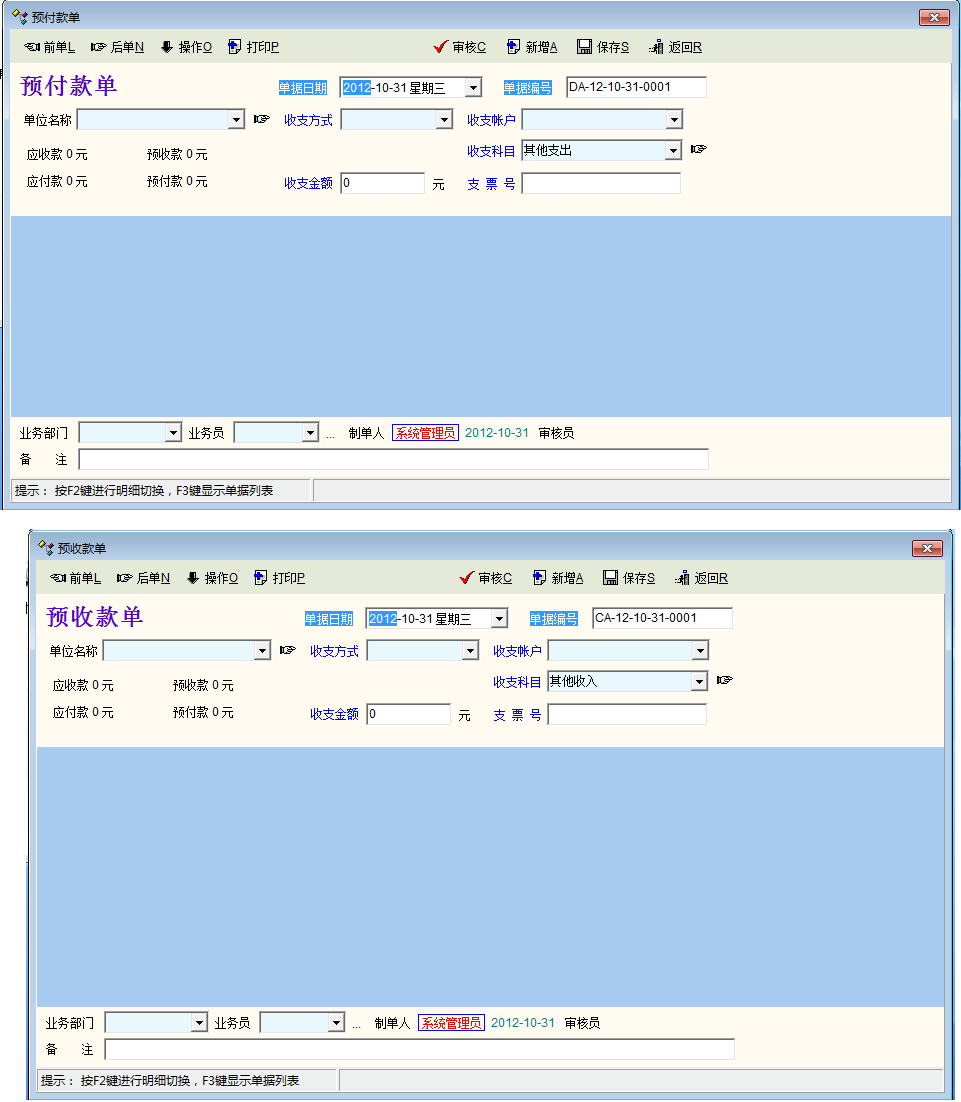 预收付款单调整好合适的大小后显示定制保存,这2个单据没有明细,因此只对大小产生作用。