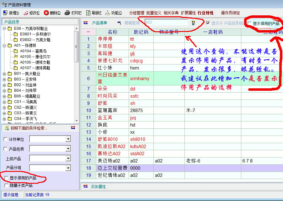 使用这个查询,(包括模糊查询,产品名称查询)不能选择是否显示停用的产品,有时查一个产品,显示很多,眼花缭乱。