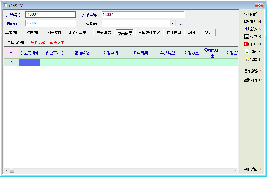 如图,建议老师在产品定义》分类信息中增加查询该产品销售明细及采购明细的信息,现实中经常需要查询某一产品的销售及采购明细,虽然销售报表及采购报表可以查询得到,但始终太麻烦。