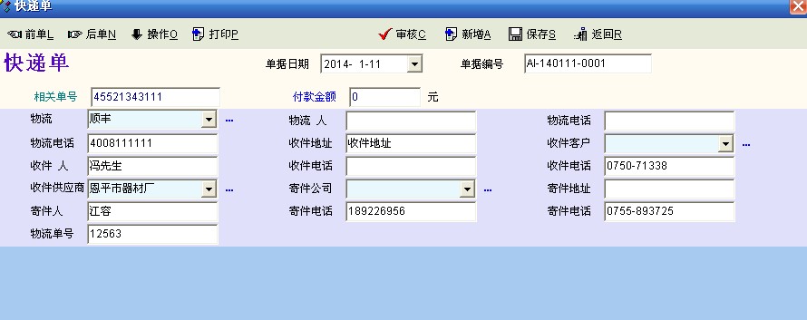建议增加物流模块 1.物流公司信息,参照供应商管理 2.物流单据管理,记录物流单据信息:包含以下信息: (1)收件公司(公司名、联系人、联系电话) (2)寄件公司(公司一般为本公司、联系人、联系电话) (3)费用信息(本公司、供应商、或客户支付) (4)回单情况(大多数情况下 销售发货单需要客户签名确认后让物流公司送回) (5)建立一个链接可以在物流公司网站查看该物流单的签收信息 3.物流单据统计报表 自己用采购模块单据做了个快递单,因水平有限, 没有将物流、收件、寄件分开显示(分开显示更直观),联系人也还不能下拉列表选择, 引用其它单据时,收件人信息也还要重新选择 有点遗憾 附图: