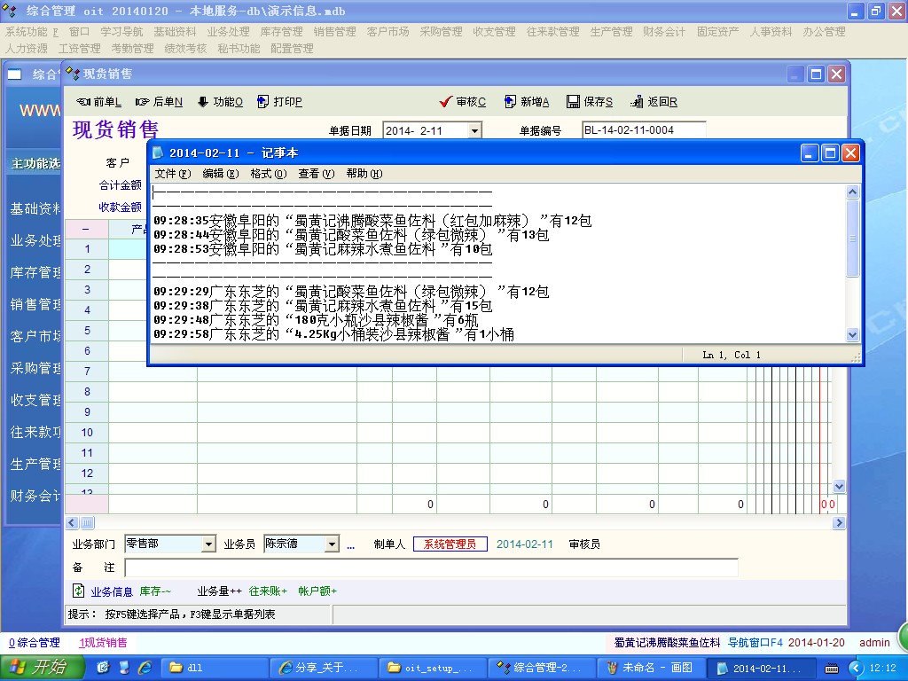 回awfixtdm 1,这个脚本的目的是对于散货在装车备货之时就另外包装好,在包装上直接写上这些散货的客户名称。当送货员送货之时直接送到客户手中,这样可以避免临时装货加快送货员的工作量以及在车内翻箱倒柜最后把车内弄得杂乱--单独的散货可以放在车内固定位置;这在推广新品之时尤其有用--快销品的新品推广常常是量少点多的试销售,客户常常不要整箱而只要一箱中的部分作为尝试。 2,弹窗确实有鸡肋之嫌,这个可以按照各人要求去除,无非就在相应代码之前加上“//”注释完事,如果将来用得着就把“//”去除即可,如果永远不用直接删除; 3,作为备注打印在送货单据上亦不可取。因为有些货品是不允许退换货,而在正常情况下是允许退换货的,这些不允许退换货的产品必须在单据中体现,如果用脚本写下了声明不允许退换货之时,单据的备注信息不可能再写入其他的信息了。这个我有试过。 int cell_change() { { if(res_cat_id==xxxxxx)//xxxxxx指产品目录,如果是指定的某个产品就把"res_cat_id"改成 "res_name==xx产品"或者“res_id==xx产品的编码”就行. note_info='不退货不换货'; }; return 1; } 4,我在脚本之中也写入到了以日期为文件名的文本文件之中,这个文件是每天或者有开单的日期作为文件名的文本文件;当然,增加业务员或送货员再加上开单日期作为文件名就更加合理了。并且我后来还写了一个脚本,在主菜单中直接打开这个文件,避免了对于电脑不熟悉的开单人员去翻文件夹的麻烦。 int 分割线(); { string drawline,addline,today; today=get_cur_date(); drawline='------------------------'; addline='echo '+ drawline+' >> "'+get_home_path()+'\散货记录情况\'+today+'.txt"';//写入到指定目录的文件中 system(addline); return 1; }; int func_before_save() { 分割线(); 分割线();//我是执行两次,就是划出两条分割线,这样两个单据之间就更加清楚 return 1; }; 这个脚本说明:如果想要划几条分割线,就执行几次“分割线()”这个自定义函数。并且放在“int func_before_save()”这里,就是每个有散货的单据得以区分,这个函数是在保存前就执行“分割线()”这个自定义函数。如果想放在其他如审核,打印等等都行,但不建议放在“int cell_change()”之中,不然每修改一行都会触发,也就是都会划线,做不到区分不同单据的目的。; 以下的脚本是在主菜单添加打开这个以开单日期的项目,在系统功能--主窗口脚本定义: int main() { string today,res; today=get_cur_date(); res=get_home_path()+'\散货记录情况\'+today+'.txt' menu_add_file('N_Top_System',0,'item_run_today_csp','打开今天非整箱或整件文件',res); return 1; } 其实这个脚本是为我自己以及我一个朋友写的(我们都是做调味品批发的,只是在不同的省)。不要把那些个体老板们都想得是电脑高手,他们短期雇佣的人也不会是只开单据的人,他们能够把软件已有的功能用清楚都非常不错了--包括我自己也还没有用清楚这个软件。 |