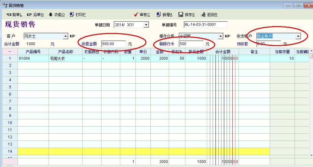 在【现货销售】里,我是这样分配的【现金】和【银行卡支付】的金额