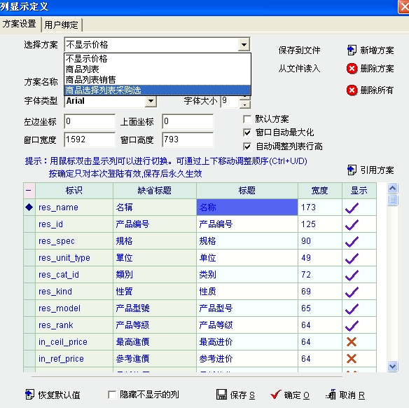 第一图是管理员用户,在产品资料列表的列定义中,已对用户显示方案进行绑定了