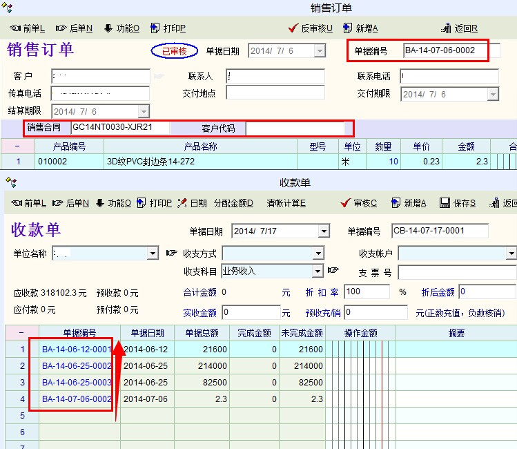 如果你收款单在明细中要体现。请自己写脚本解决。