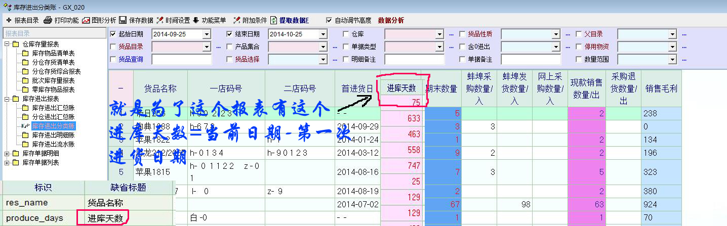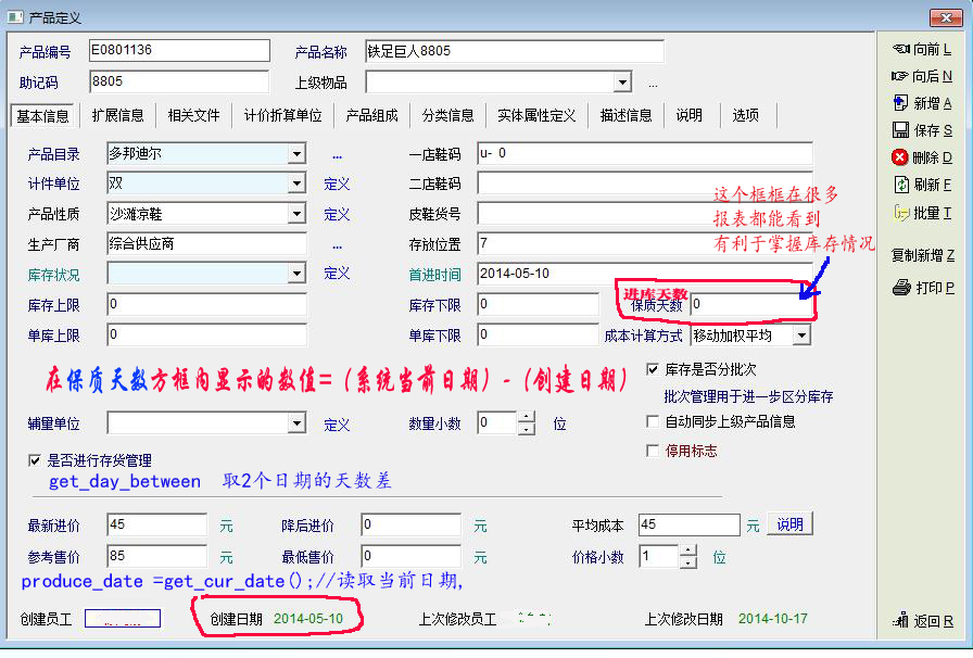老师你好:向你请求一个帮助,我在软件脚本帮助里看到有取两个日期的天数差的脚本函数get_day_between ,我想把产品定义里面的保质天数,改变成产品进库天数,让它的值=(系统当前日期)-(创建日期),如下图所示,这样一改,在很多报表都能随时随地掌握产品进库时间了,希望老师不吝指教。