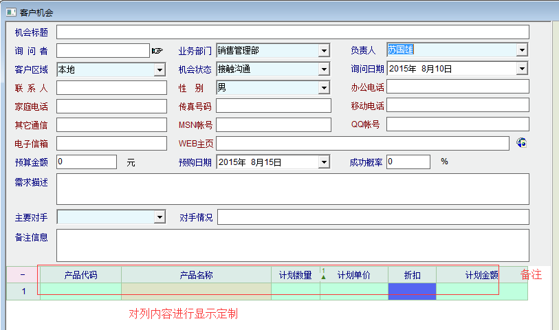 6、在明细内容中像物资单据一样添加一些可以自定义的扩展列,还有备注列,行业属性扩展列等,并且添加列内容显示定制功能。这样,在许多情况下,客户机会可以取代系统中的报价单,不但顺畅了流程,提高了效率,也可以充分发挥客户机会的提醒功能,非常高效、方便的对销售机会进行跟踪、管理。