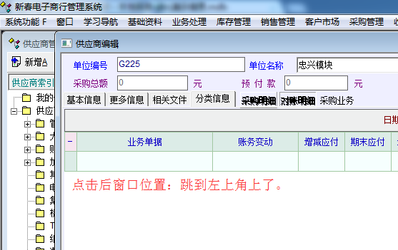 脚本中没有涉及改变窗口位置的语句、函数,但运行脚本后却改变了窗口位置。添加了脚本后,我一点击红色框内的控件,打开了的供应商编辑窗口不管在什么地方,总是跳到左上脚本这个固定的位置上去,什么原因呢?具体脚本如下: int func_f9_call() { return 1; }; int func_show_win() { string begin_date; begin_date=date_add(get_cur_date_std(),-365); gui_set_val("DateTimePicker_Beg_Date",begin_date); //gui_set_tabsheet_pos("TabSheet_Info",0); gui_set_parent("SpeedButton2","PageControl"); gui_set_parent("SpeedButton_Ebm_Check_Detail","PageControl"); gui_set_parent("SpeedButton_Io","PageControl"); gui_set_x("SpeedButton2",250); gui_set_x("SpeedButton_Ebm_Check_Detail",305); gui_set_x("SpeedButton_Io",360); gui_set_font_color("SpeedButton2",0x000000); gui_set_font_color("SpeedButton_Ebm_Check_Detail",0x000000); gui_set_font_color("SpeedButton_Io",0x000000); return 1; }; int func_create_rec() { return 1; }; int func_edit_rec() { return 1; }; int func_delete_rec() { //can_delete=1; return 1; }; int func_save_rec() { //can_save=1; return 1; }; int obj_change() { //change_obj return 1; }; |
