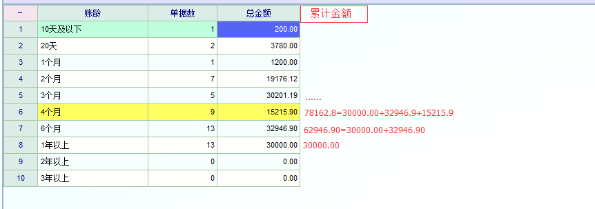 以报表中的6个月为例,现在的总金额统计的是6-12月这段时间产生的尚示结清的欠帐的账龄。想添加的列(累计金额)统计的是账龄超过6个月的所有欠款数。有了这个统计列,对总体的欠款掌握就更加直观,全面了。