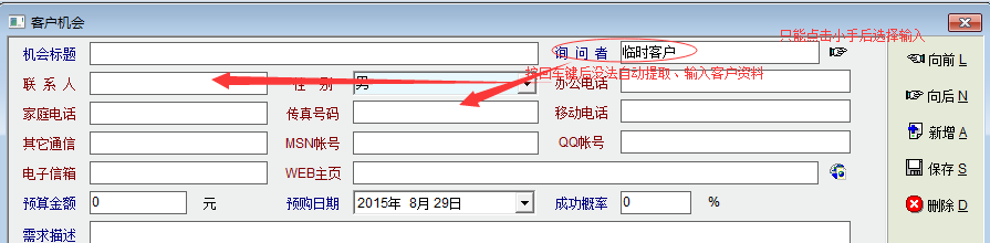 在客户机会编辑界面中,当输入的“询问者”(客户)是系统中的存档客户时,按回车键没法自动提取客户的资料,而是必须通过点击“询问者”右边的小手按钮后选择输入客户后才能提取该客户的资料。在其它的系统功能,如客户接触、客户管理、销售单等等中一般是输入存档客户名称或编码后回车就可以提取客户资料的。