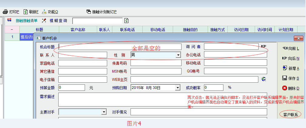 第一次点击自己创建的按钮(客户联系),可以正确执行脚本,传递参数到新窗口。然后,如果再次点击按钮(客户联系),则有两个不正常现象:1、没法重复、正确执行脚本,如图片3所示,没法再次打开客户联系编辑界面并传递参数;2、如图片4所示,原来的客户机会中所有输入的资料全部不见了,就像新增了一条客户机会记录一样。