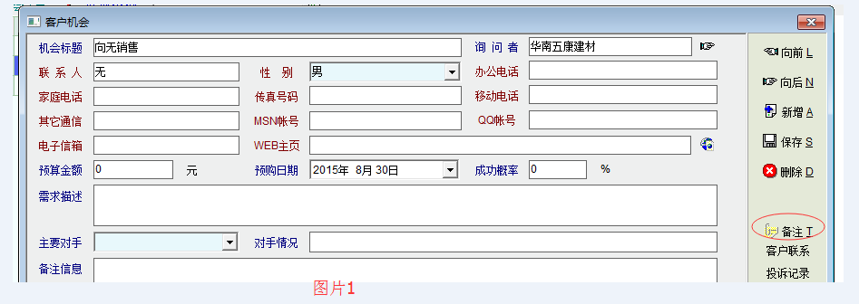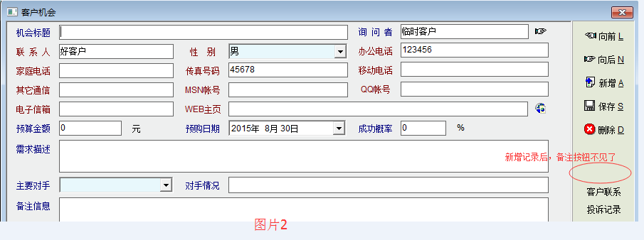 发现客户机会中还有另外几个问题:1、进入客户机会管理界面,打开旧记录时,界面有“备注”按钮,如图片1所示。但新增客户机会记录后,“备注”按钮就不见了,如图片2所示。