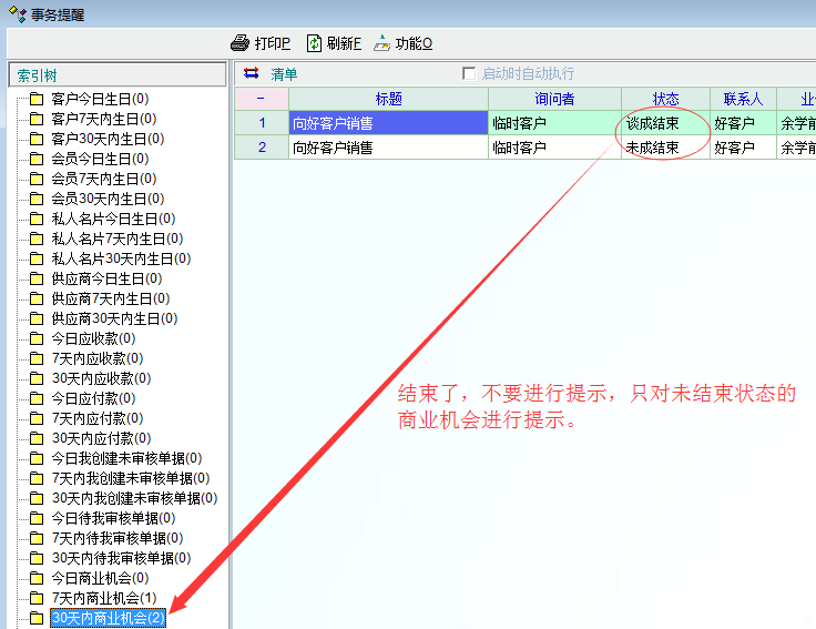 1、事务提醒中对于商业机会的提醒没有结合机会的状态,对于处于结束状态的机会应该避免进行提示,以免干扰正常的提示。